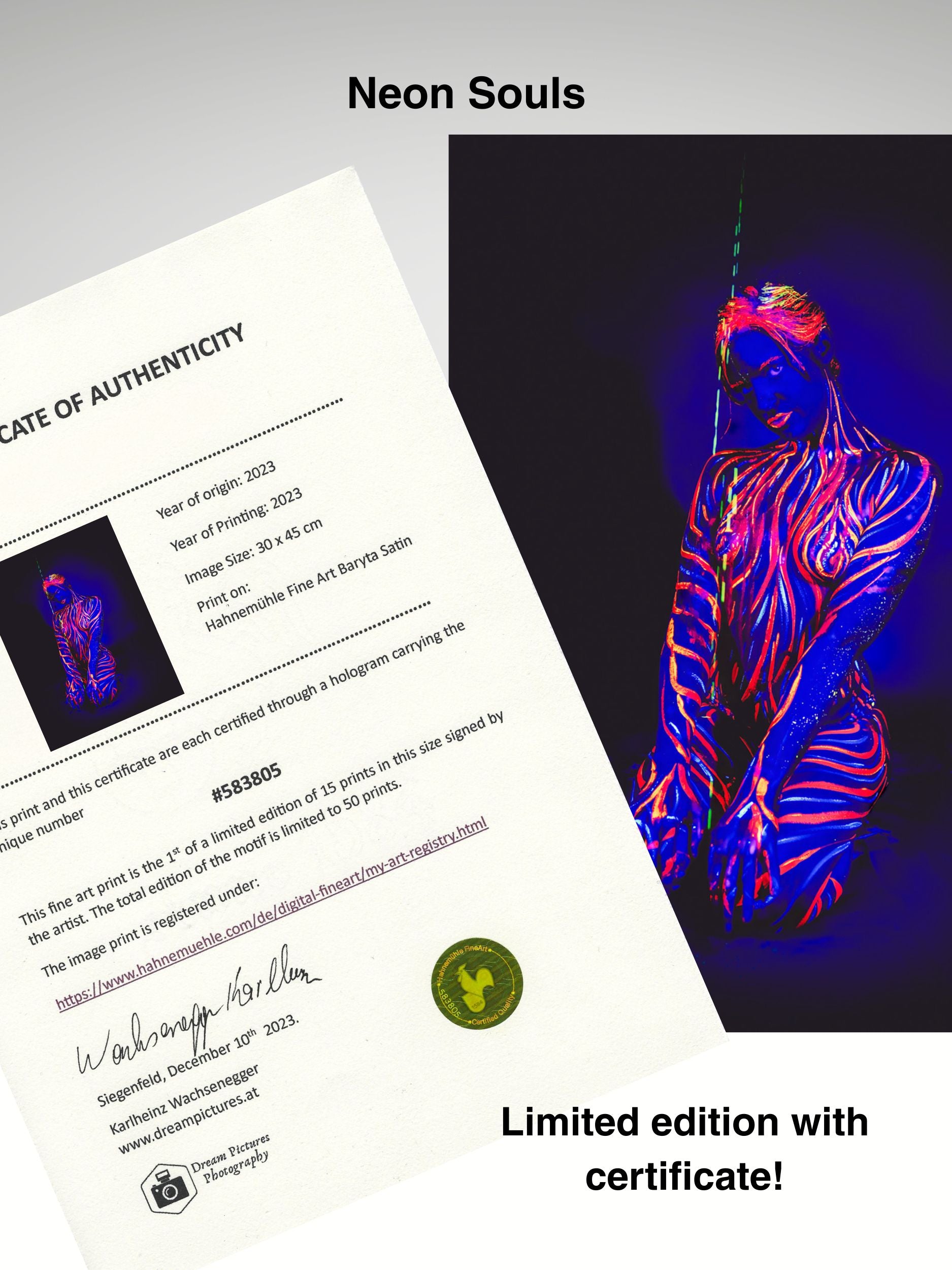 In “Neon Souls #04,” a playful and sensual moment unfolds. The luminous figure enjoys a neon-green glowing drink that cuts through the darkness. Red UV-painted lines wrap around her body like pulsating energy streams. Her relaxed profile blends futuristic aesthetics with a sense of pleasure and intimacy.