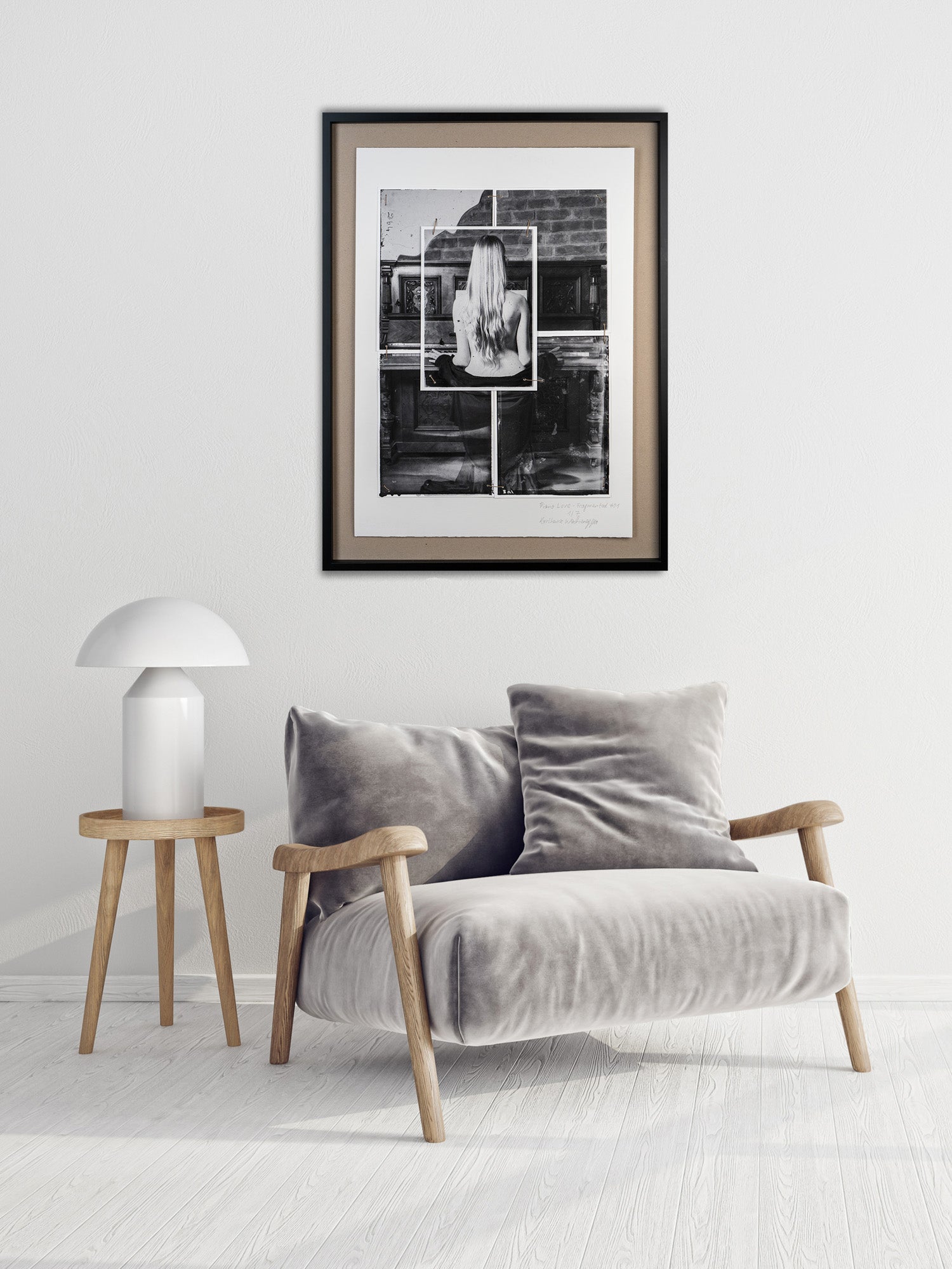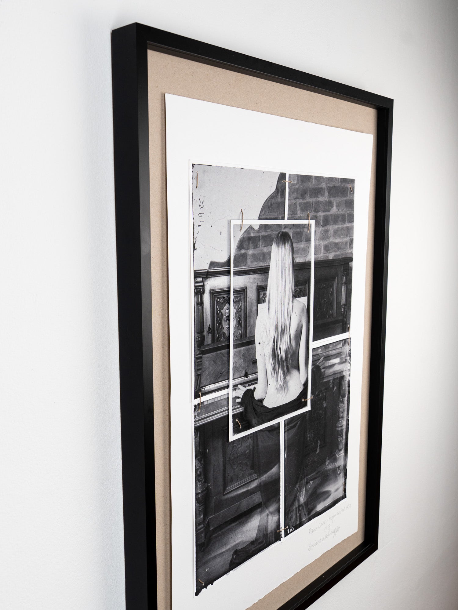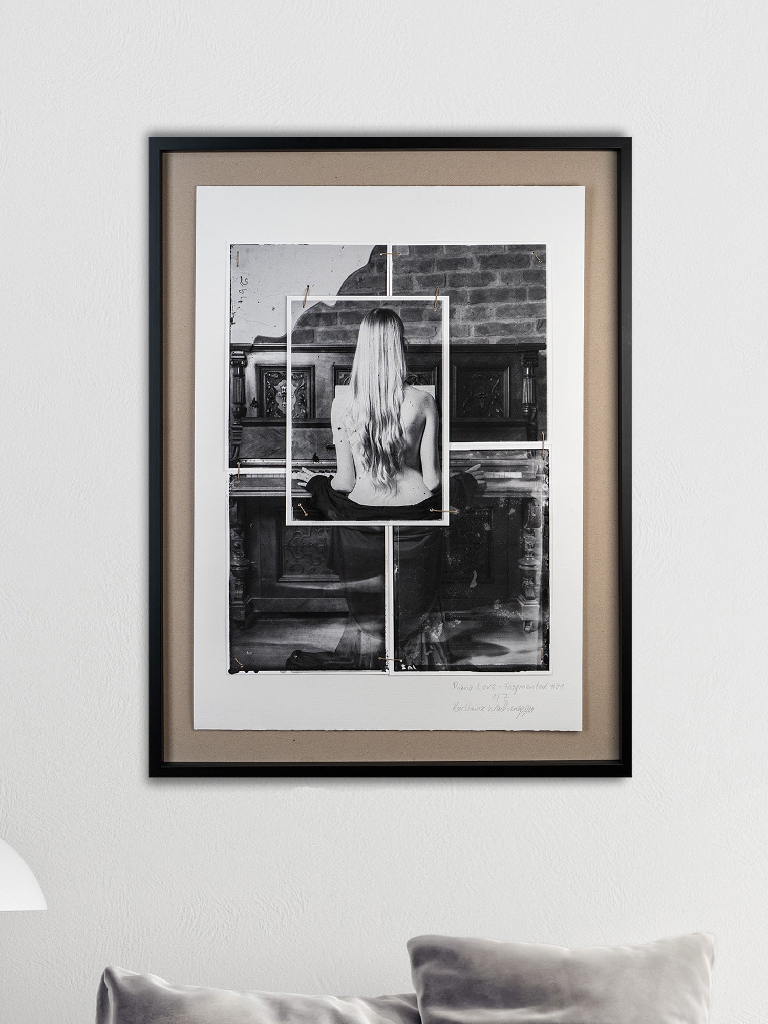 Printed on Hahnemühle Photo Rag Bright White paper, the piece reveals a soft matte surface that emphasizes the tonal range and fine details. The bright white base intensifies the contrast between image and background, lending the intimate scene—a woman portrayed with her back turned in front of a piano—a quiet yet striking presence. The matte surface reflects light in gentle nuances and lends the intimate scene—a woman portrayed with her back turned in front of a piano—a near-sculptural presence. The appearance of an aged wet-plate photograph, created through scratches, spots, and intentional signs of decay, evokes a historical atmosphere and opens an associative space between past and present.