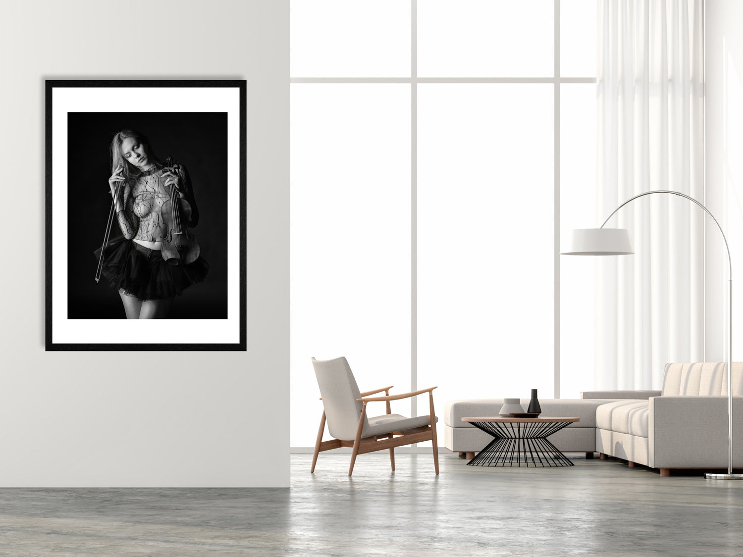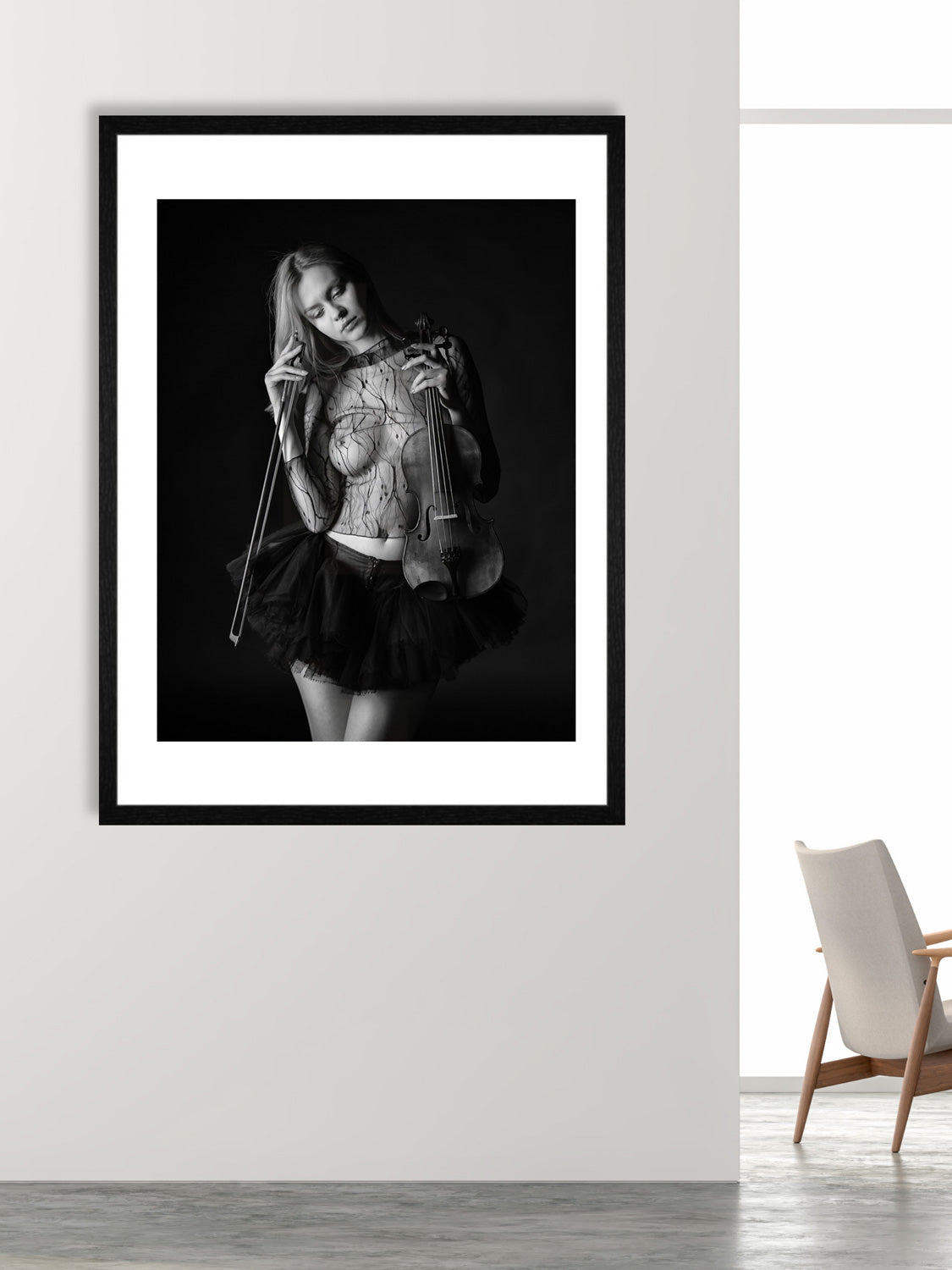 In “Violin Love #9”, the musician loses herself in a moment of deep intimacy. Her lowered gaze and gentle posture give the image a delicate melancholy, while the violin rests at her side like a quiet companion. A subtle atmosphere of memory, softness, and inner resonance.