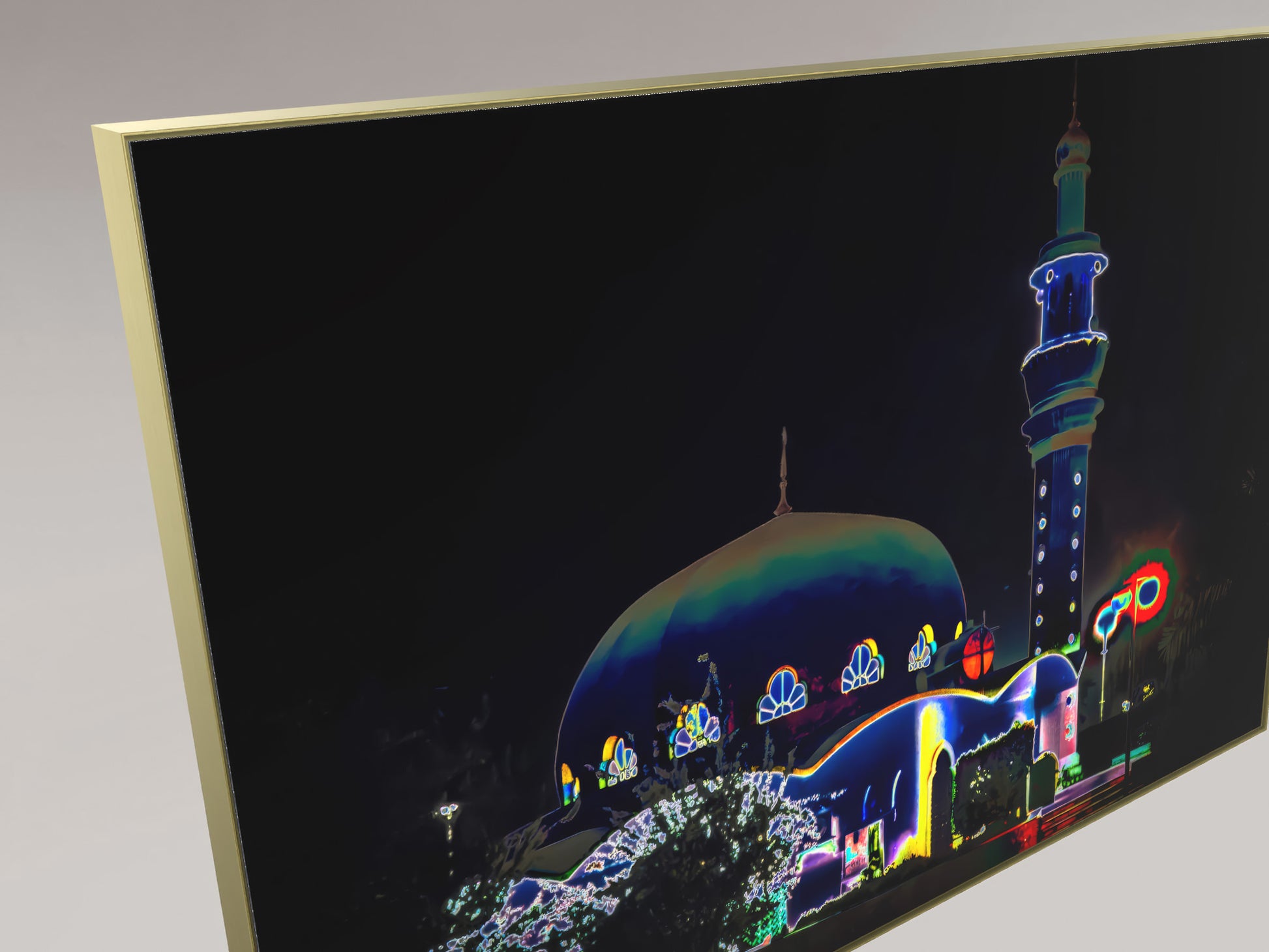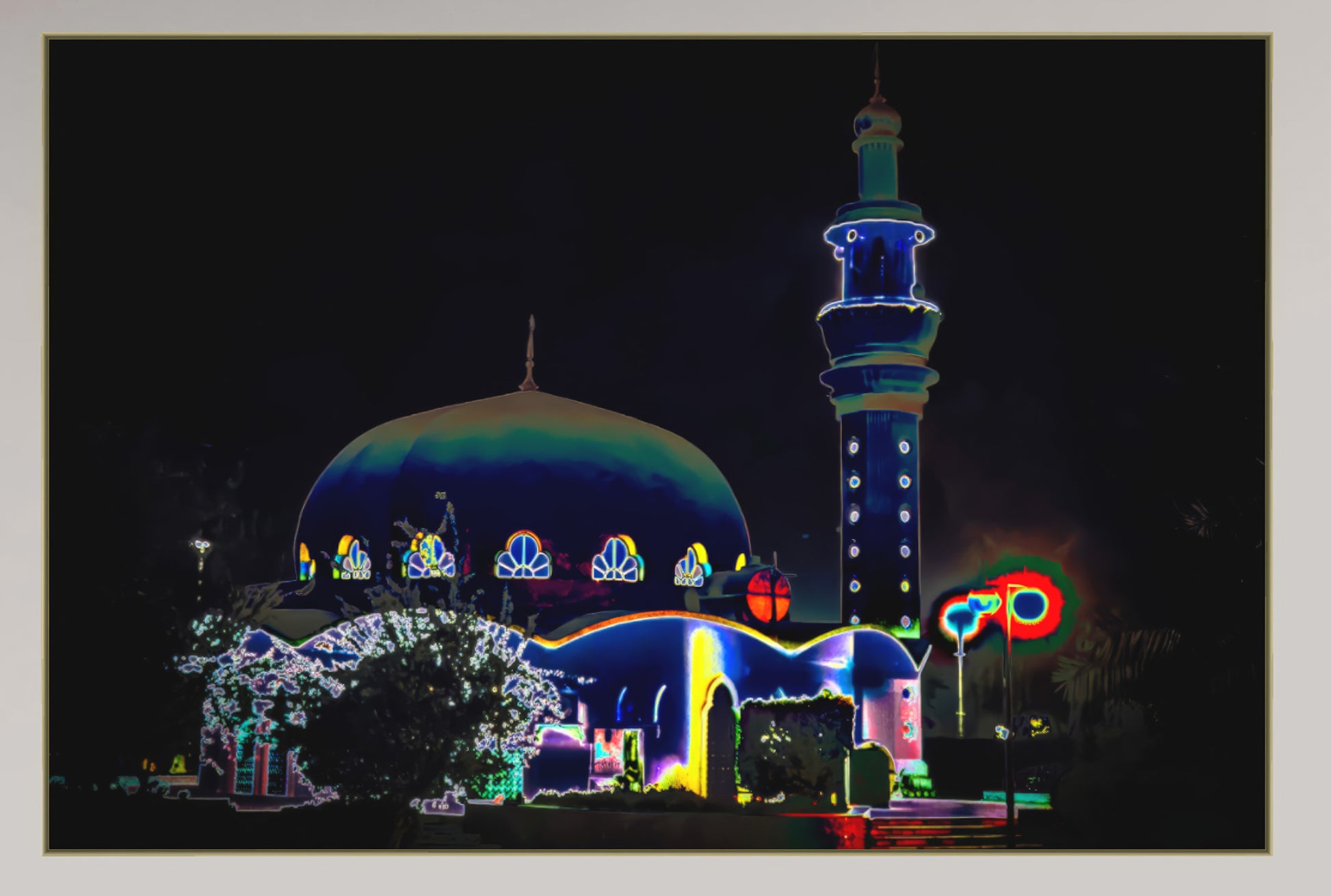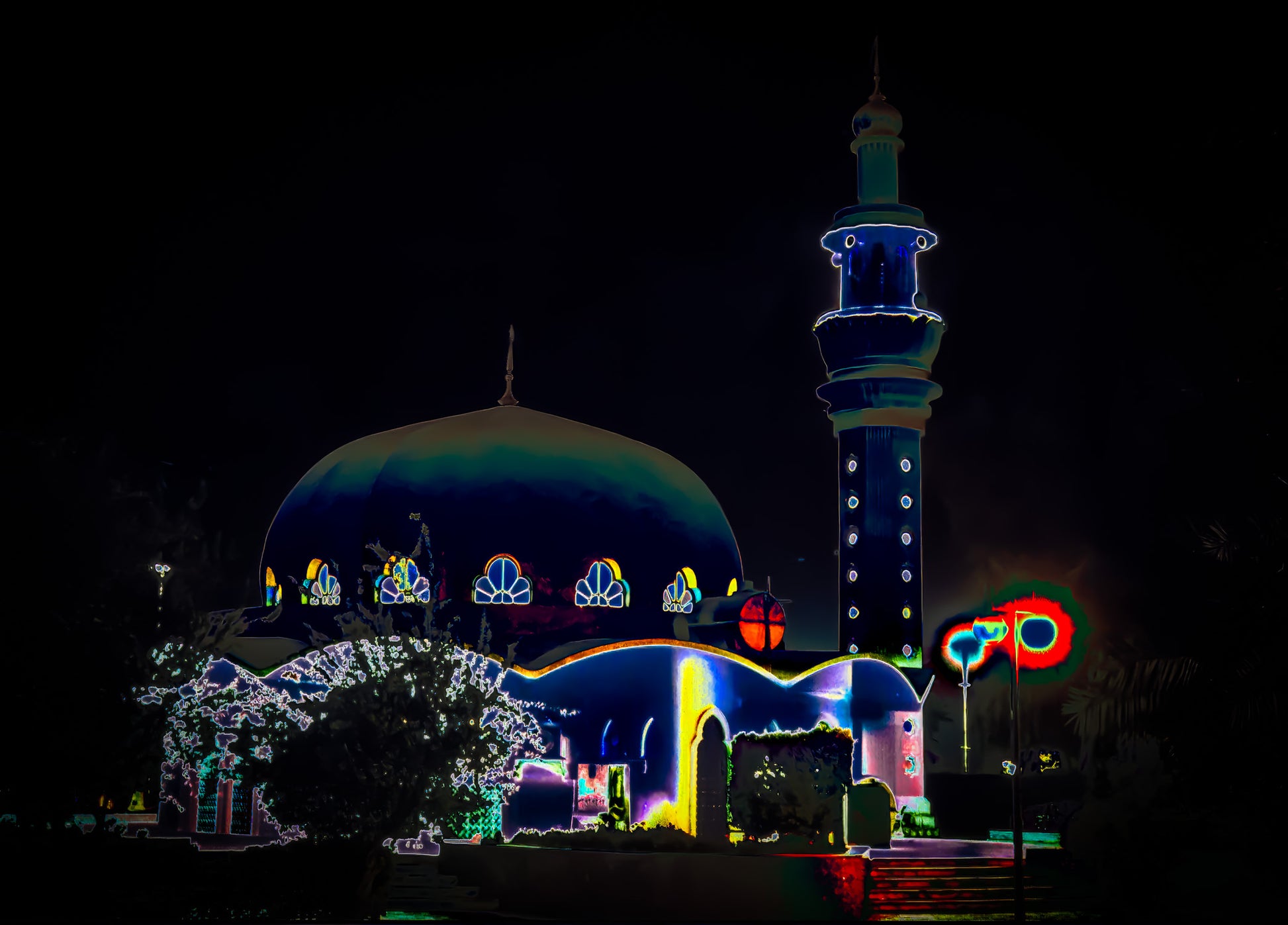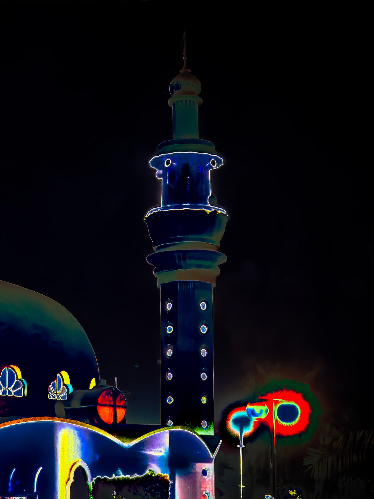 Eine Moschee bei Nacht in Abu Dhabi – ihre Kuppel erhebt sich majestätisch in die Dunkelheit. Die digital
