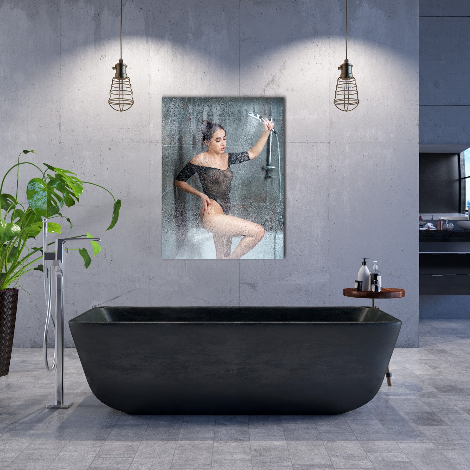 In dieser Szene richtet Emilia das Wasser sanft über ihre Schulter – eine Geste der Selbstfürsorge, eingefroren in Licht und Tropfen. Die ruhige Komposition schafft eine Atmosphäre des Innehaltens und passt perfekt in modern-minimalistische Räume mit Sinn für Ästhetik.