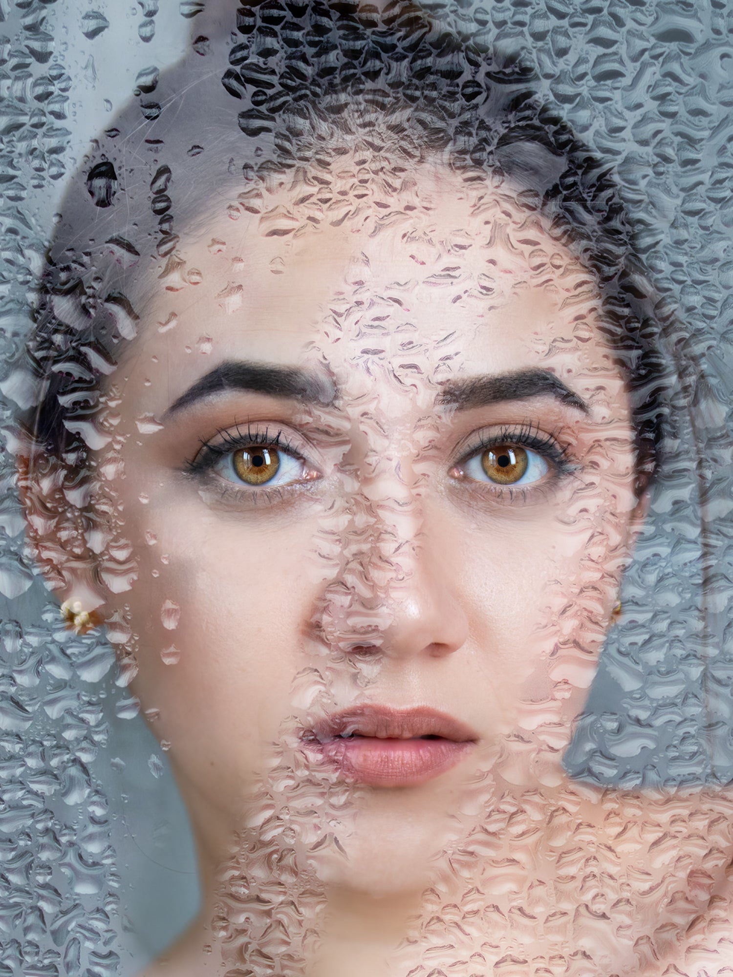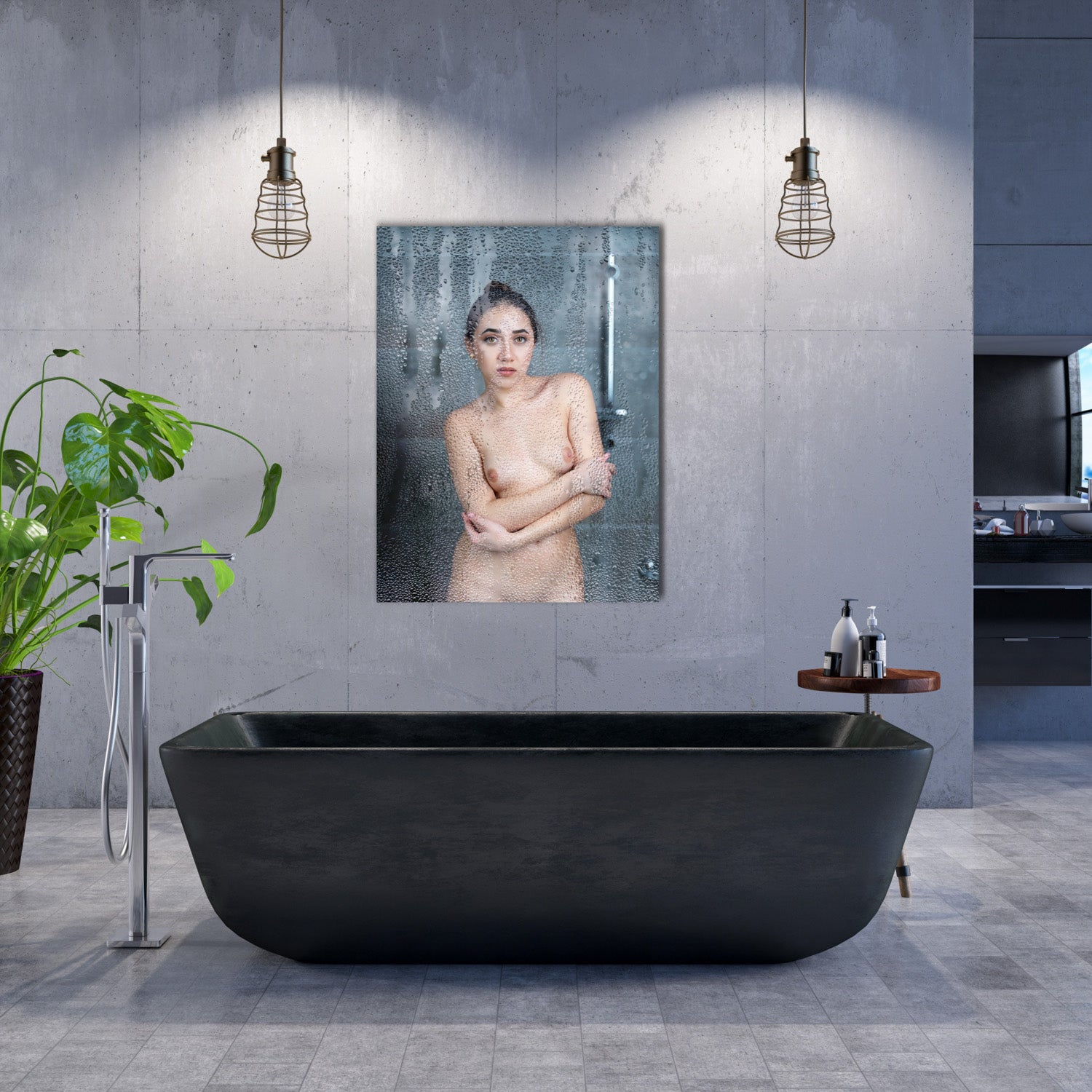Der direkte Blick durch das beschlagene Glas verleiht dieser Aufnahme eine intensive Präsenz. Emilia wirkt verletzlich und doch stark – ein emotionaler Moment, der Räume mit Persönlichkeit erfüllt.