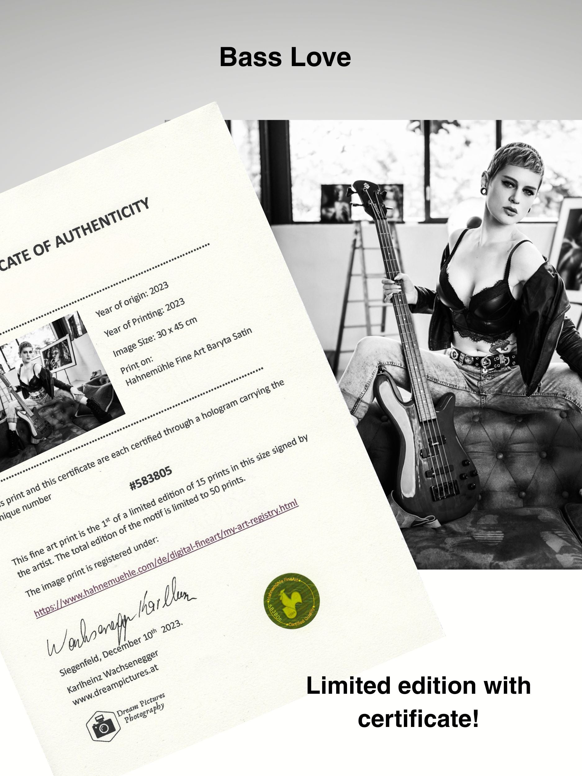 In „Bass Love #07“ entsteht ein verträumter Moment am Fenster. Die Musikerin sitzt in einer lässigen Haltung, das Instrument eng an sich gedrückt. Das natürliche Licht formt sanfte Konturen und verleiht der Szene einen nachdenklichen, fast melancholischen Charakter. Ein stiller Dialog zwischen Innenwelt und Außenwelt.