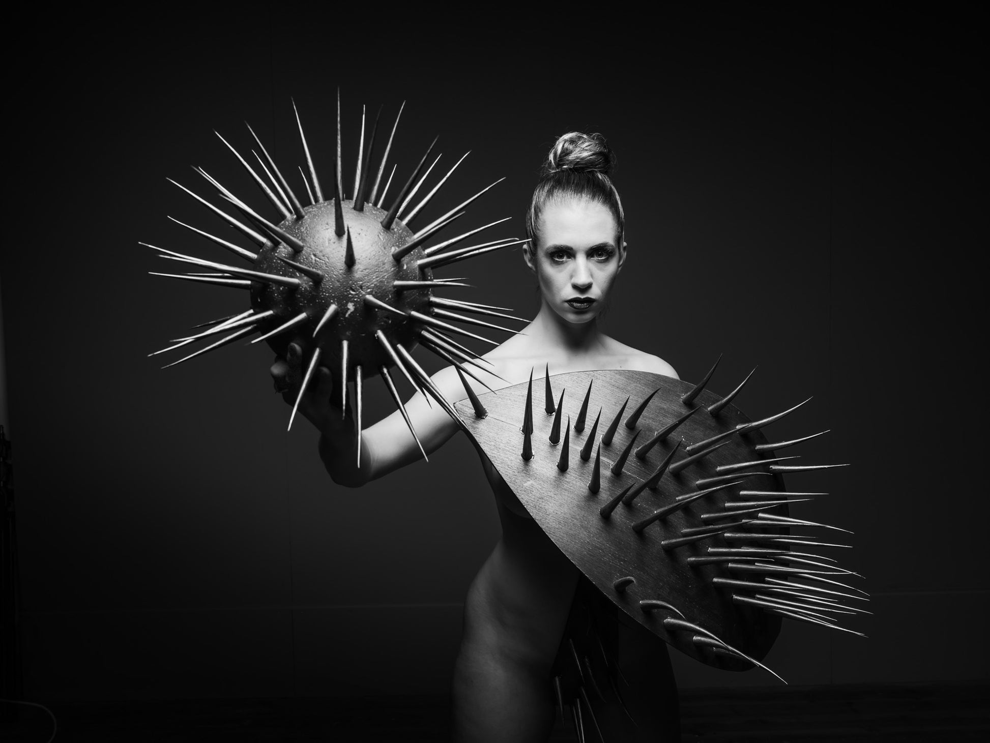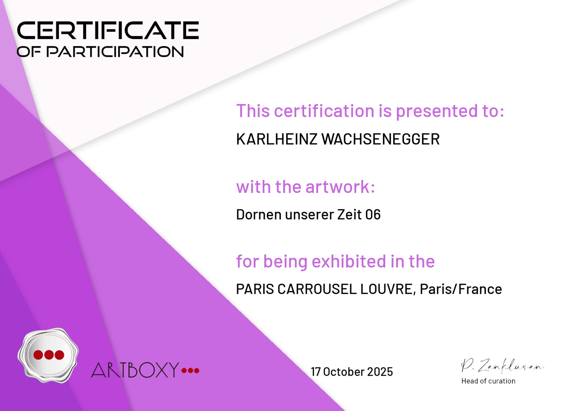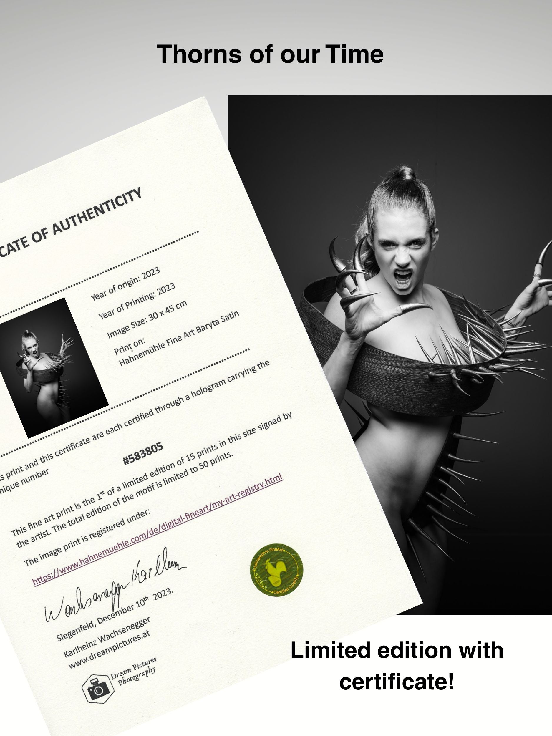 In „Dornen unserer Zeit #06“ wird Verantwortung sichtbar. Die Protagonistin trägt die Dornen nicht nur für sich selbst, sondern als Spiegel kollektiver Bedrohungen. Konflikte, Umweltveränderung und globale Unsicherheit verdichten sich zu einem Symbol, das nicht abgelegt werden kann.