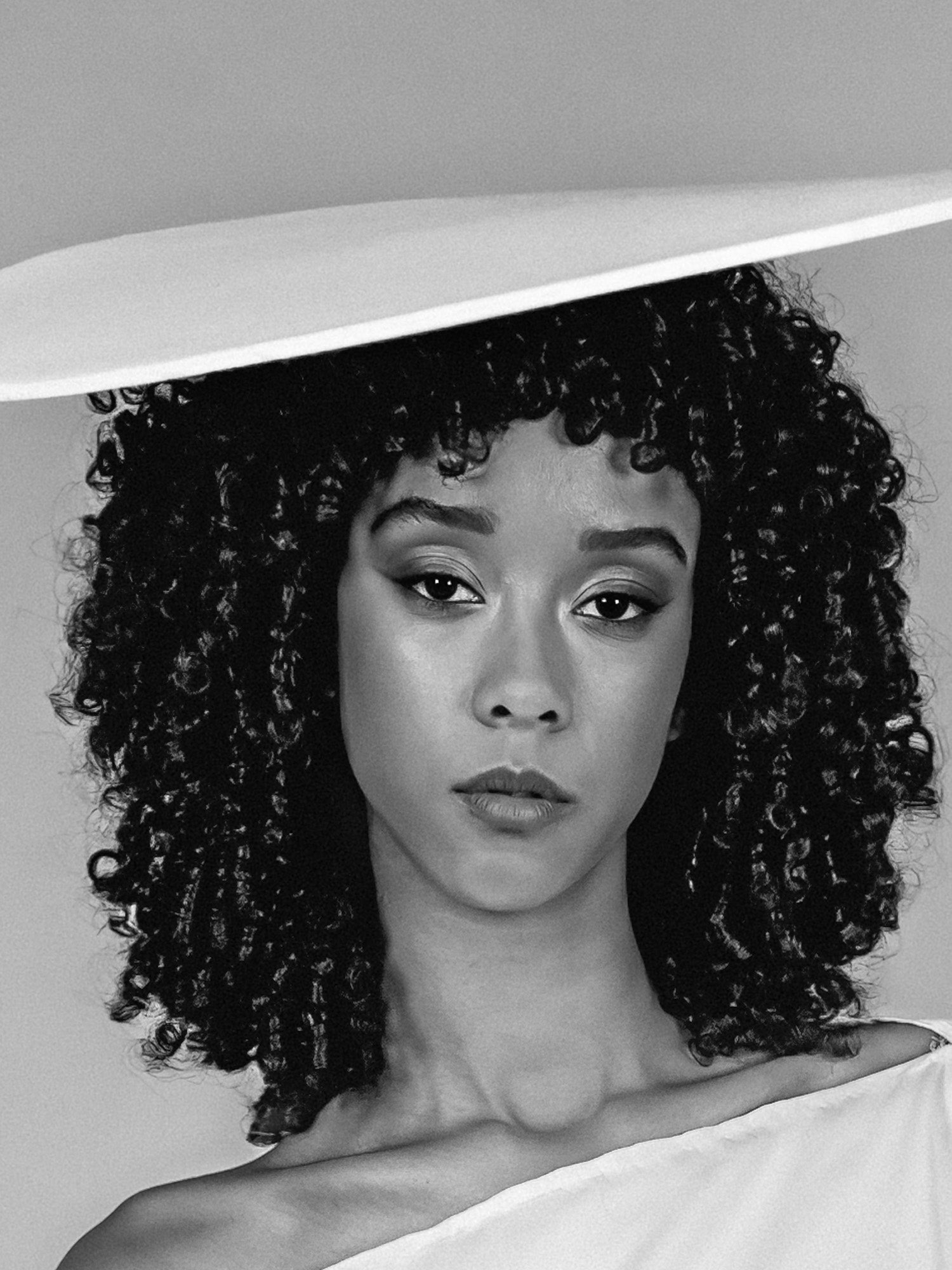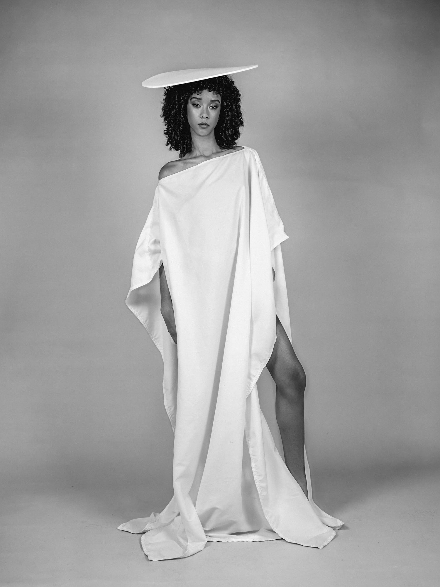 In „Fragile Ikone #05“ zeigt sich die Präsenz in zurückgenommener Ruhe. Der Körper ist von fließendem Stoff umhüllt, der flache Hut liegt ruhig über dem Haupt und schließt die Komposition wie ein stilles Zeichen ab. Reduktion und Klarheit verdichten sich zu einem Bild innerer Balance und leiser Selbstgewissheit.