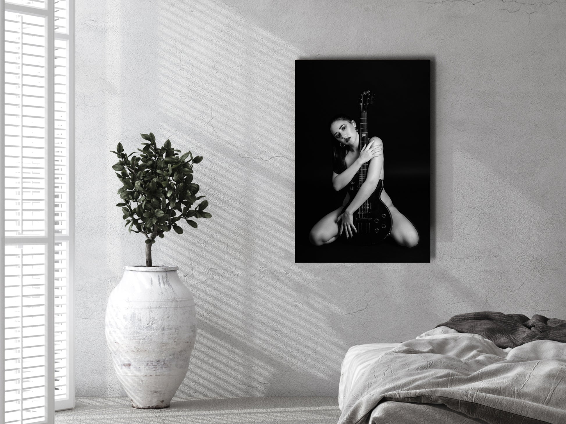„Gibson Love #12“ zeigt eine zarte, fast schützende Umarmung zwischen Körper und Instrument. Die Musikerin sitzt ruhig am Boden und legt den Kopf sanft gegen den Gitarrenhals. Ihre Arme formen eine umschließende Geste, die Nähe, Vertrauen und innere Ruhe ausstrahlt. Das weiche Licht bringt eine intime, fast poetische Stimmung in diese minimalistische Schwarz-Weiß-Komposition.
