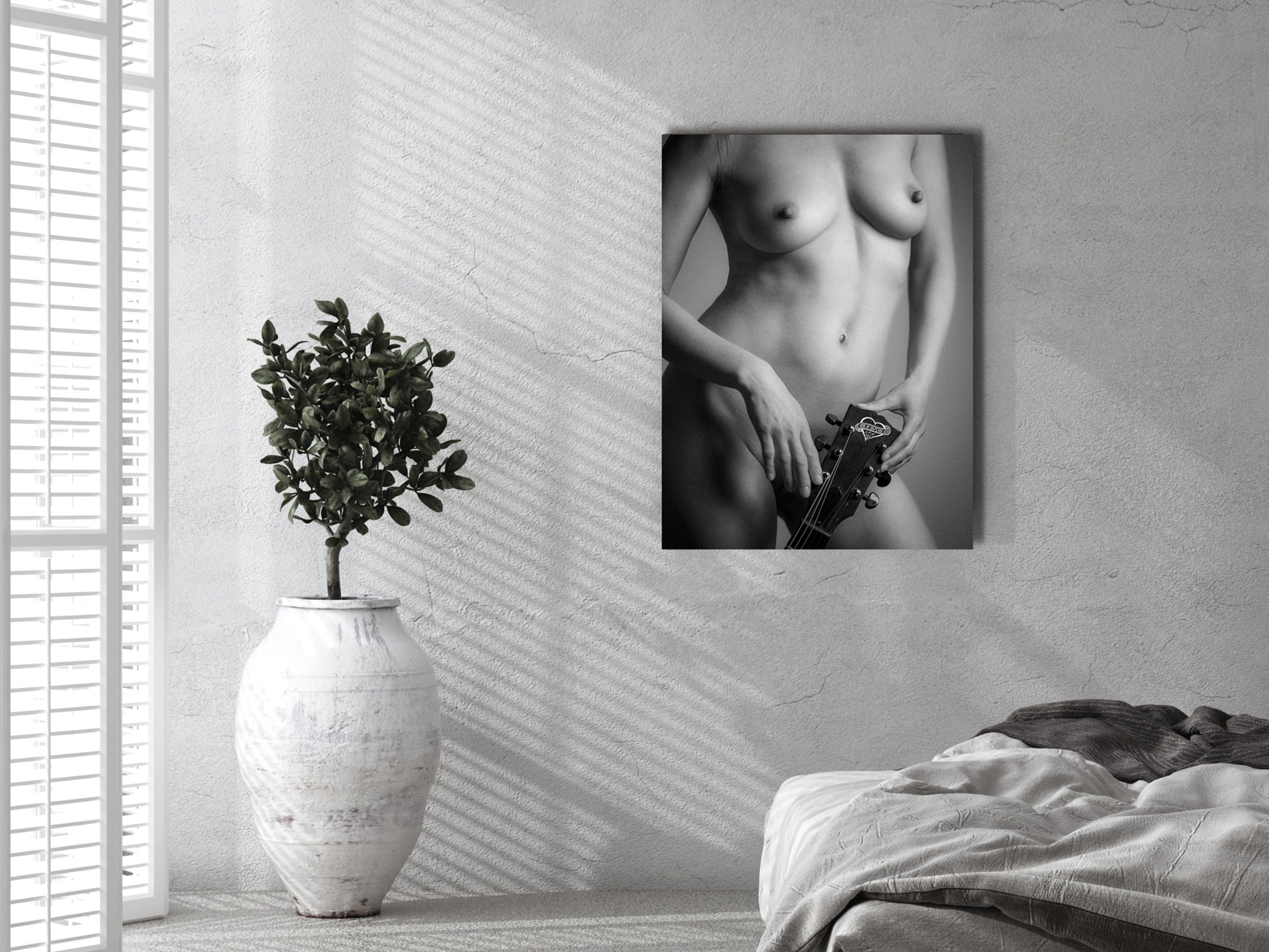 In „Gibson Love #06“ öffnen sich Körperlinien und Instrument zu einer harmonischen, leicht seitlich gedrehten Komposition. Die Handhaltung wirkt ruhig und kontrolliert, während das sanfte Licht die natürliche Textur der Haut betont. Die Szene strahlt eine leise, intime Würde aus – Musik und Körper im stillen Gleichklang.