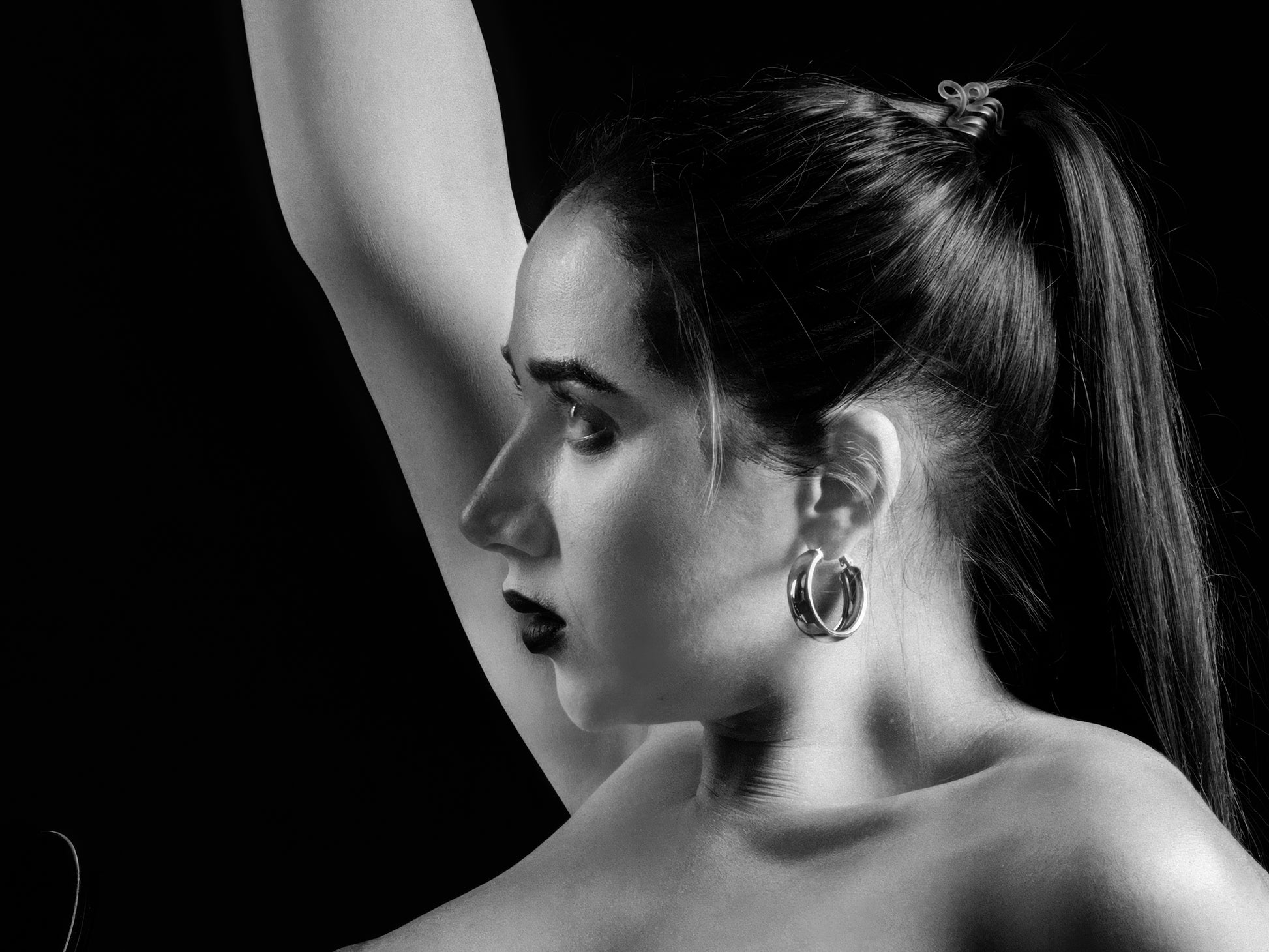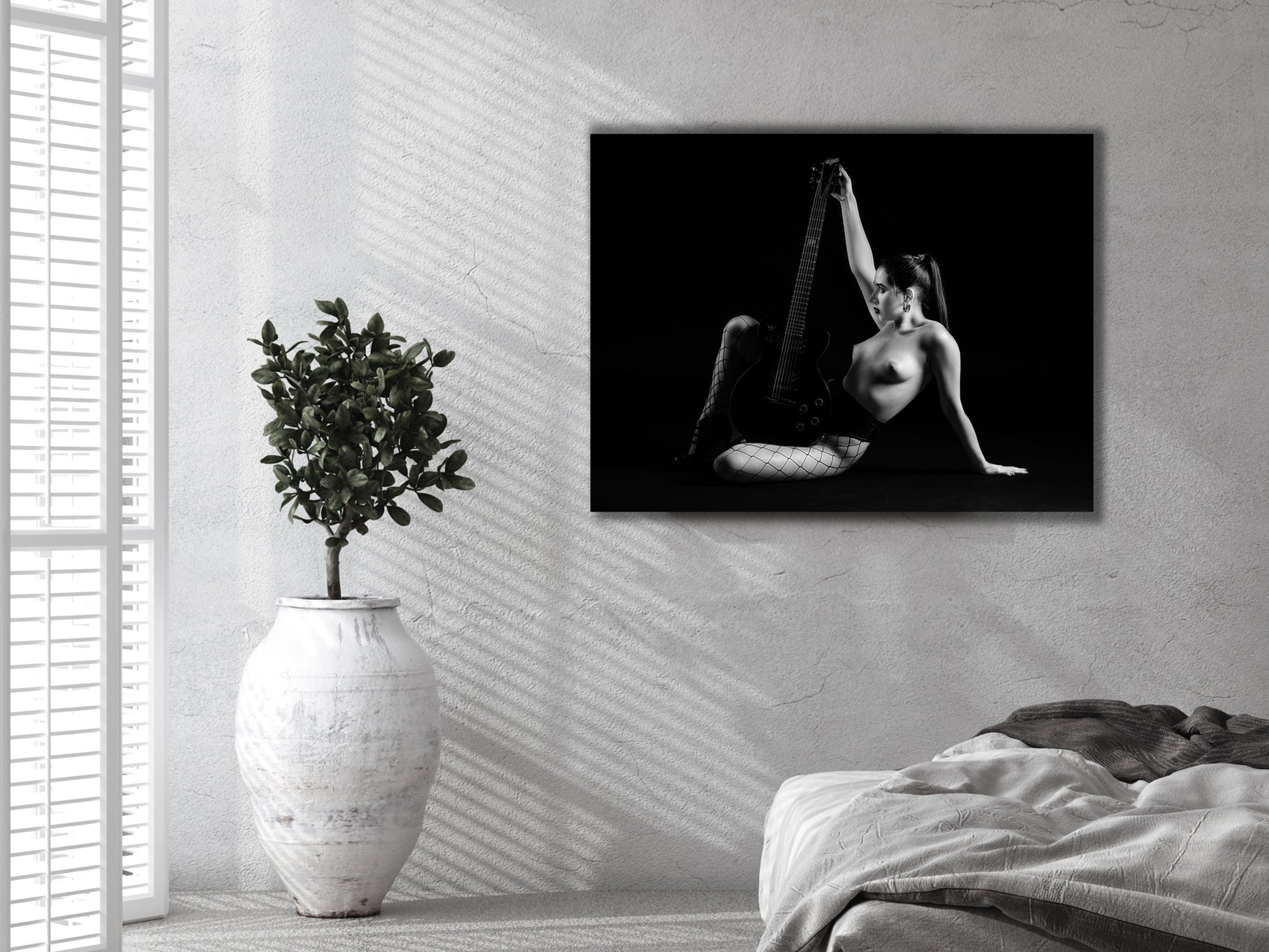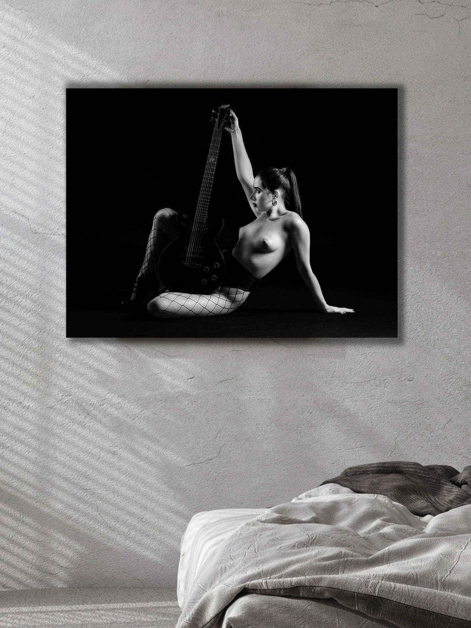 In „Gibson Love #13“ entfaltet sich eine kraftvolle Mischung aus Lässigkeit und Energie. Die Musikerin lehnt seitlich am Boden, ein Bein elegant angewinkelt, während sie die Gitarre hoch in die Luft streckt. Ihre Pose wirkt selbstbewusst und frei, fast wie ein eingefrorener Moment einer Bühnenperformance. Das Spiel aus Netzstrümpfen, Licht und Schatten verleiht dem Bild eine sinnliche Rock-Ästhetik.