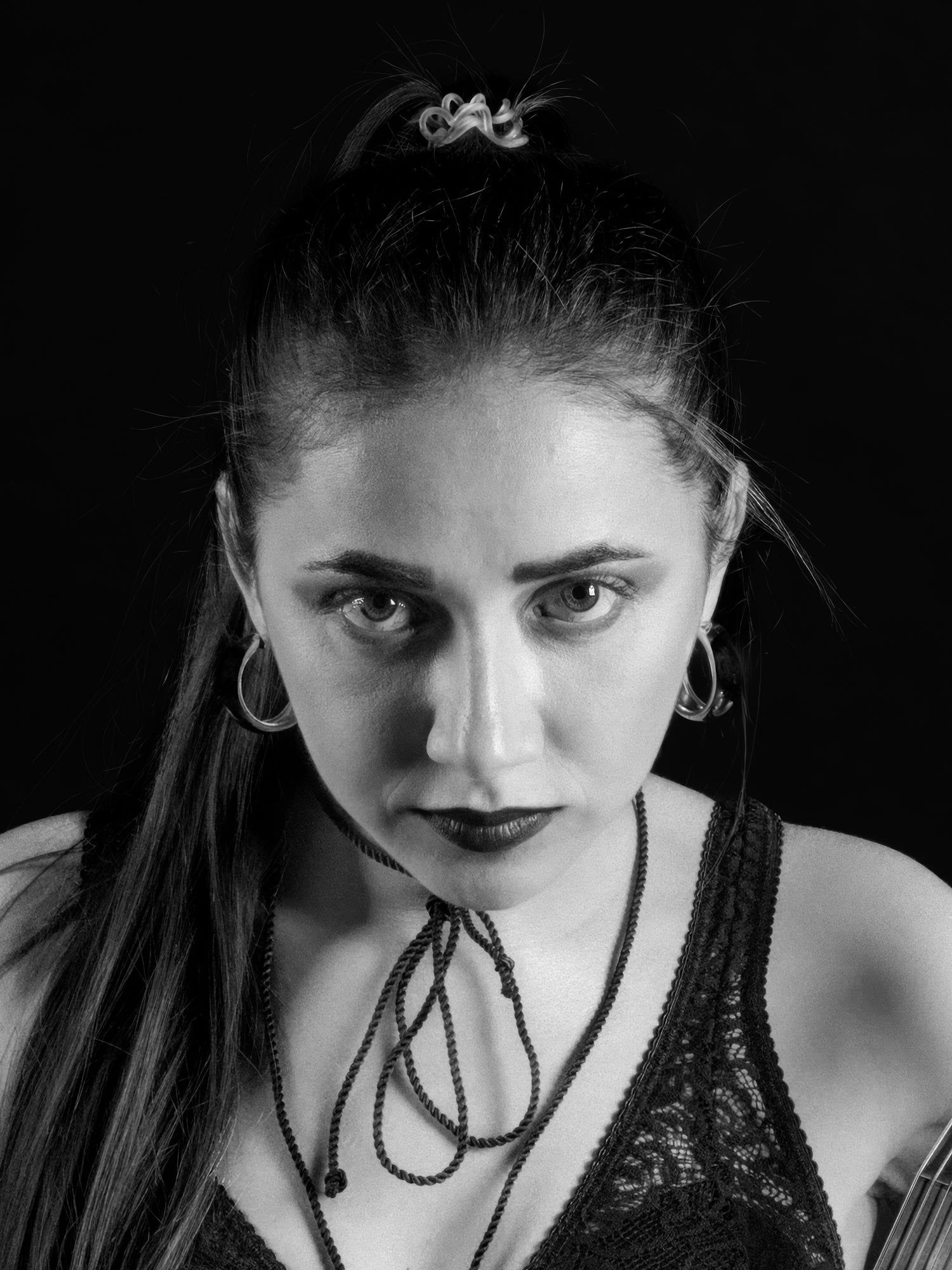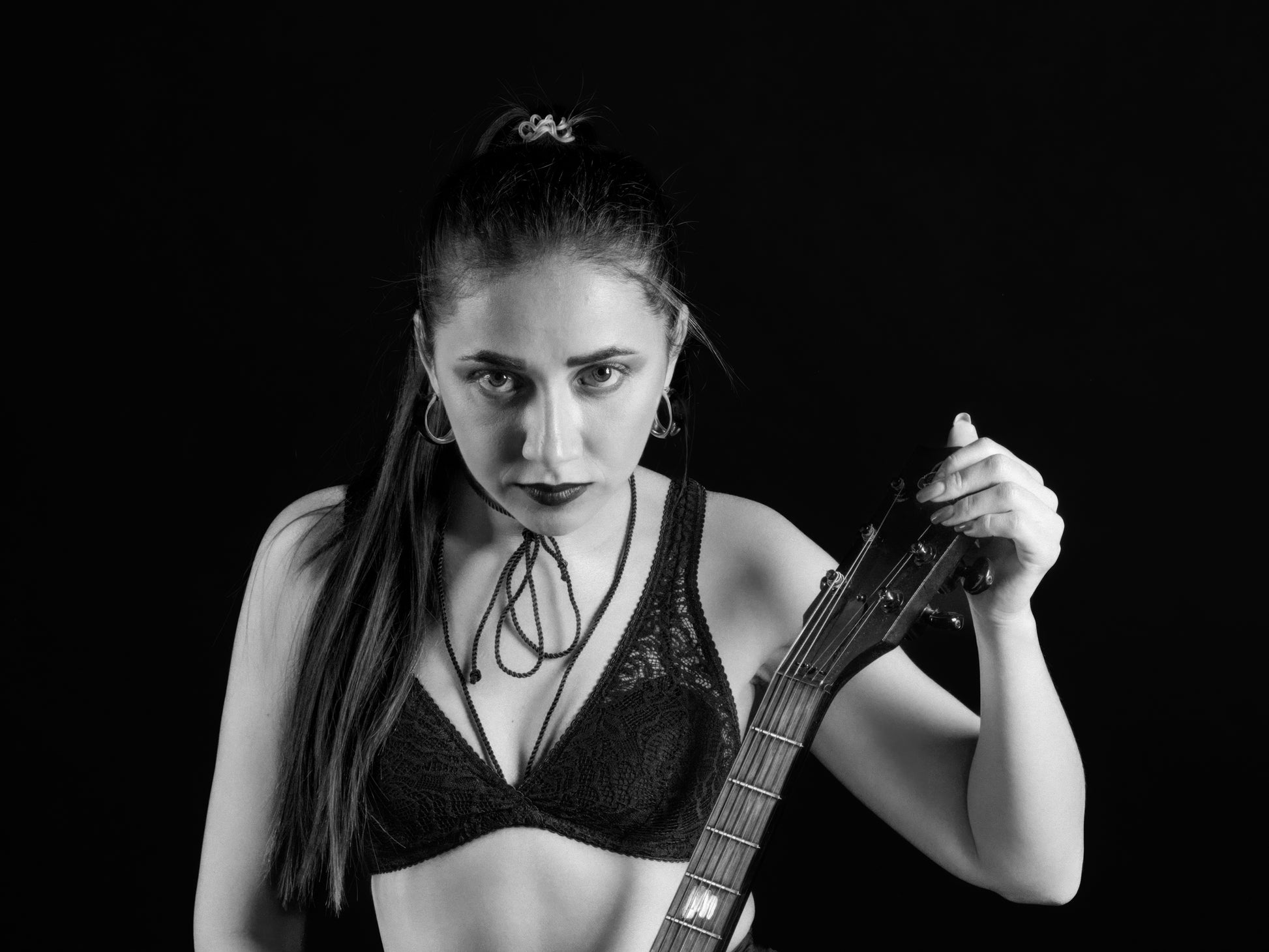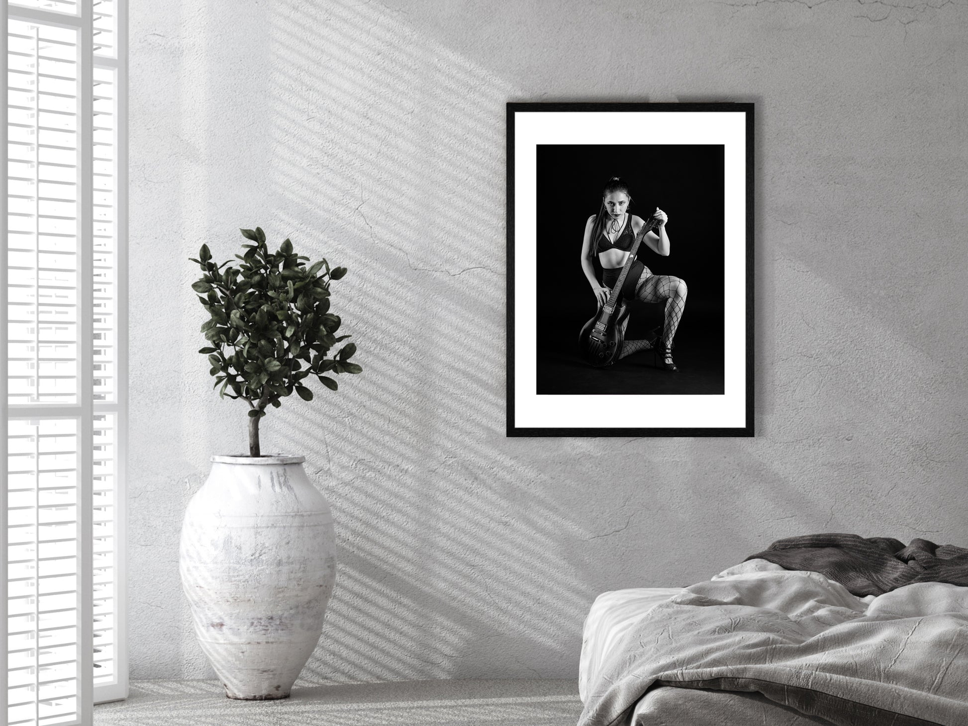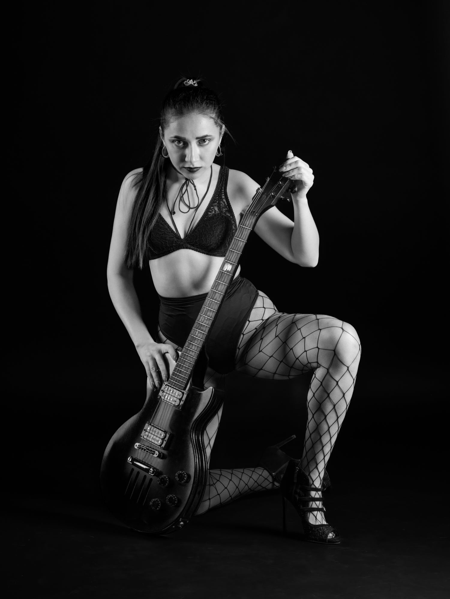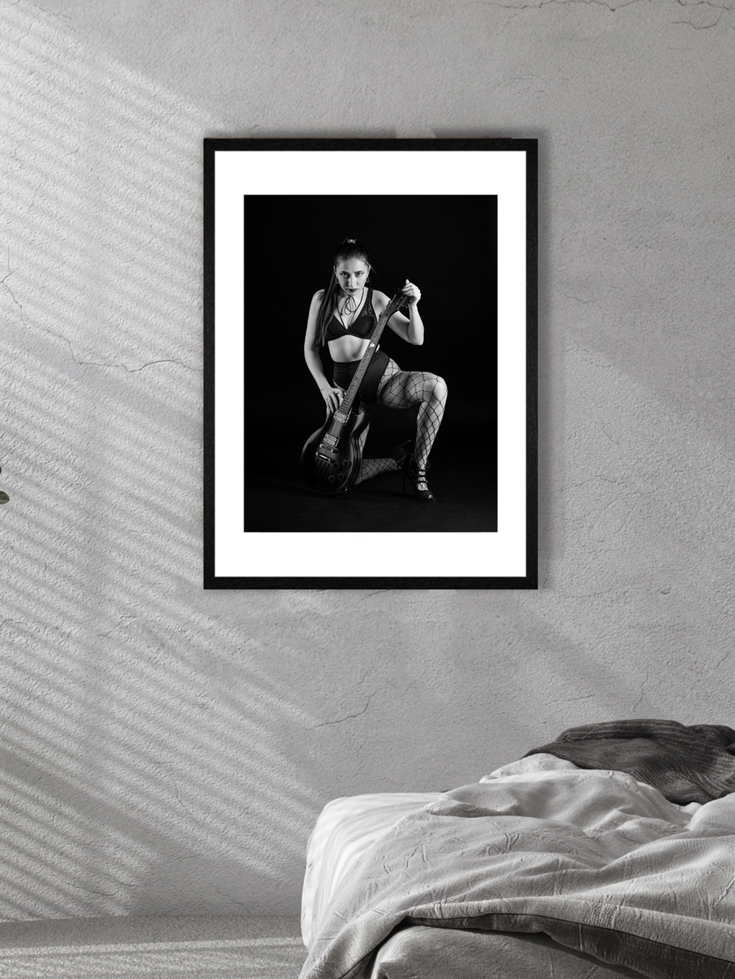 „Gibson Love #07“ bringt einen deutlichen Stilwechsel: Die Musikerin kniet im starken Studio­licht, ihre Kleidung und Pose vermitteln Selbstbewusstsein und eine rockige Attitüde. Die Gitarre wird hier zum kraftvollen Symbol, das sie entschlossen und dominant präsentiert. Die Komposition zeigt Energie, Ausdruck und einen Hauch Rebellion.