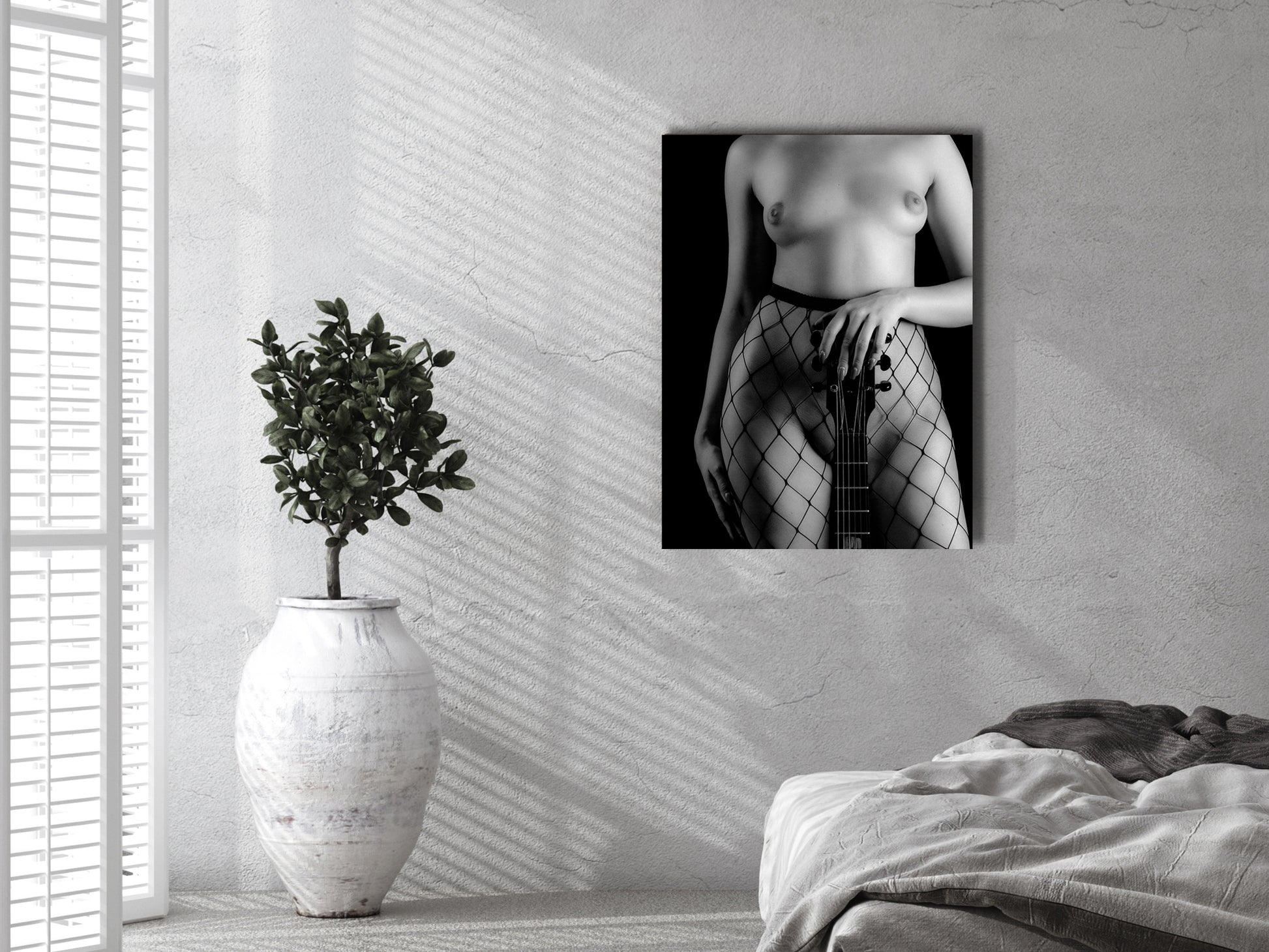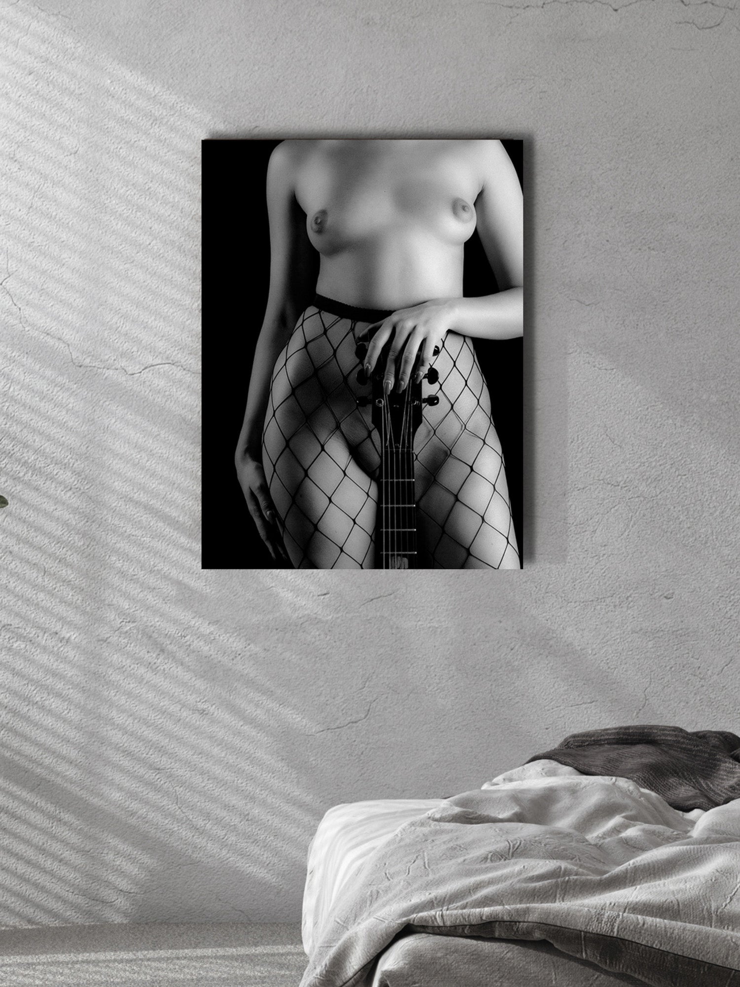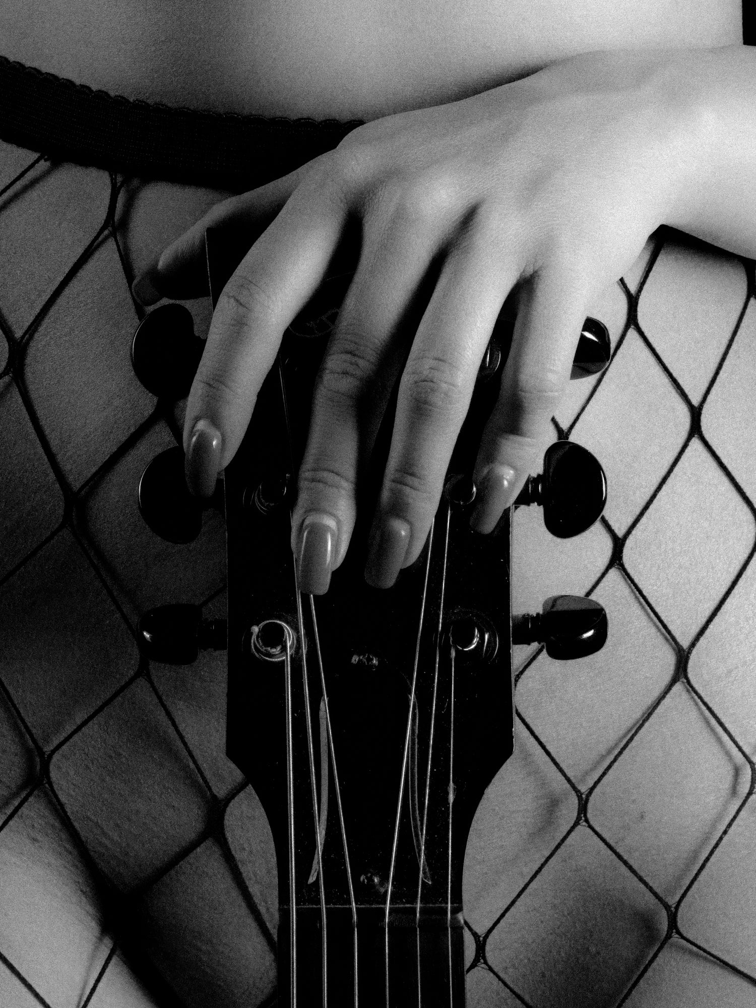 „Gibson Love #09“ fokussiert auf den Körperausschnitt und die markanten Linien der Netzstrumpfhose, die im Kontrast zum dunklen Gitarrenhals stehen. Die Szene wirkt grafisch, kraftvoll und zugleich intim. Der reduzierte Bildausschnitt verstärkt die Konzentration auf Form, Struktur und Ausdruck der Hände.