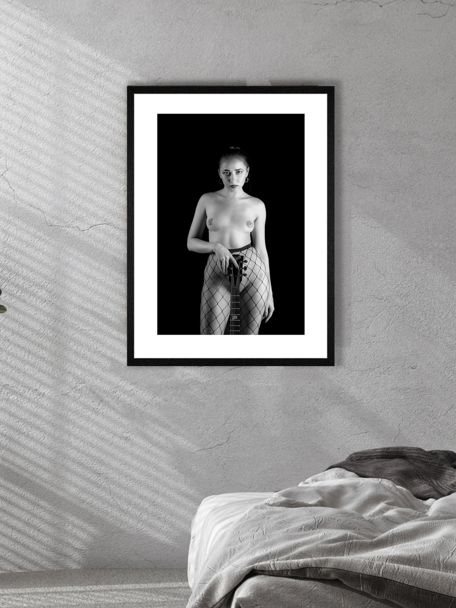 In „Gibson Love #08“ steht die Musikerin aufrecht und direkt vor dem Betrachter, der Blick ruhig und selbstbewusst. Das Zusammenspiel aus Transparenz, Körperkontur und Gitarrenhals erzeugt eine starke visuelle Spannung. Das Bild wirkt wie ein Statement über Identität, Ausdruck und die Vereinigung von Stärke und Sinnlichkeit.