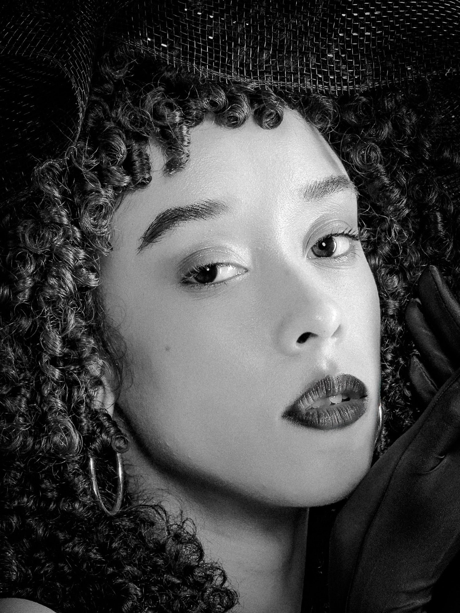 In „The Silent Empress – Crowned in Stillness #01“ tritt die ikonische Erscheinung in vollkommener Ruhe aus dem Dunkel hervor. Haltung und Blick sind gesammelt, beinahe unbeweglich, als würde sich Stärke aus innerer Stille speisen. Die markante Kopfbedeckung wirkt wie eine Krone der Zurückhaltung – ein Sinnbild stiller Würde. Licht und Schatten formen eine zeitlose Präsenz, in der Zerbrechlichkeit und Autorität in Balance stehen.